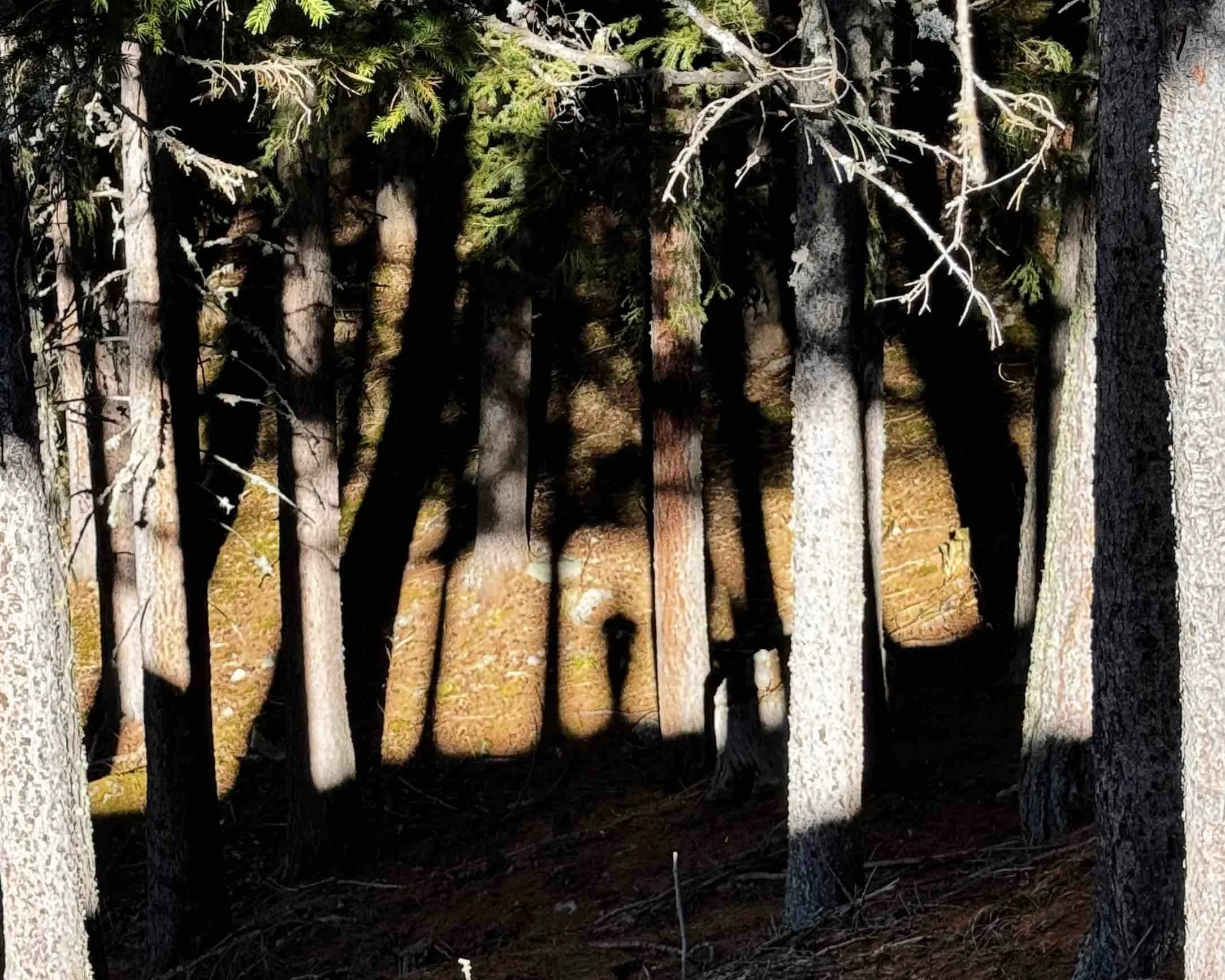 Proprio come le superfici a specchio dei laghi sono in grado di raddoppiare il paesaggio, l’inclinazione del sole di quel pomeriggio stava raddoppiando gli alberi. Era una foresta fitta composta non solo da larici e pini, ma anche dal pendio del terreno, dal sole basso e dal tempo. Tutto stava contribuendo alla forma del bosco; compresa la mia ombra, entrata anche lei in quel campo. Non stavo cambiando il paesaggio, eppure ne facevo parte.